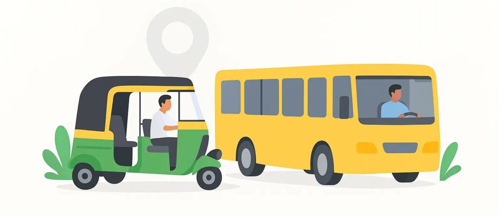 Track Your Auto Track Your Auto Route 1 ▶ Auto 1 – Ramesh Track Auto 2 – Suresh Track Route 2 ▶ Auto 3 – Naresh Track Auto 4 – Rajesh Track Route 3 ▶ Auto 5 – Mahesh Track Auto 6 – Raju Track Track Your Bus Track your BUS >